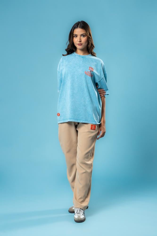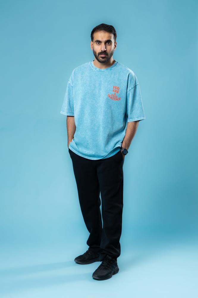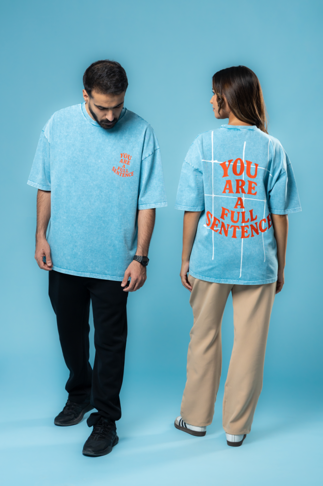تيشرت عصري بلونه الأزرق الجذاب، مطبوع بعبارة بارزة "YOU ARE A FULL SENTENCE"